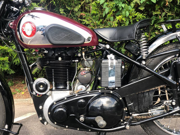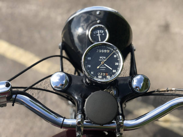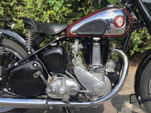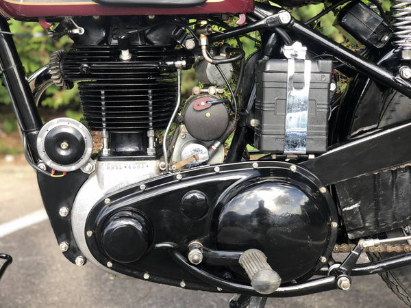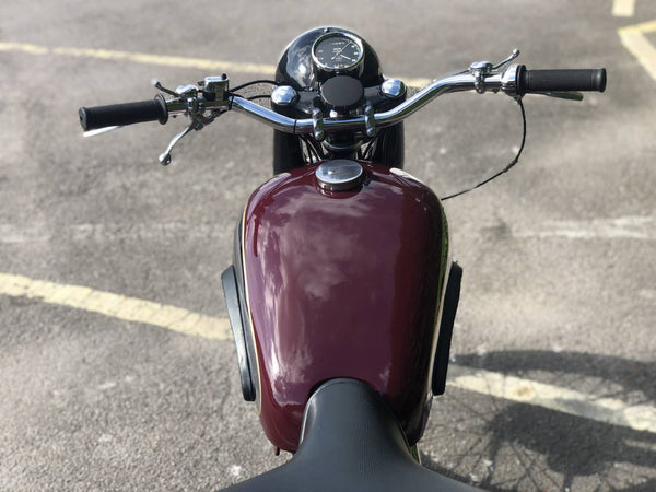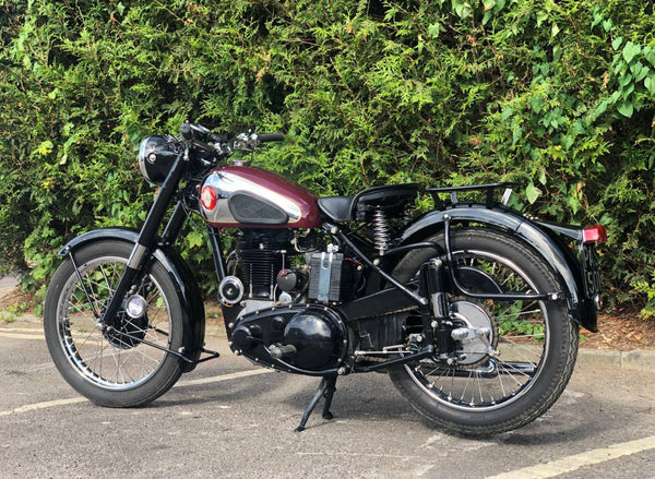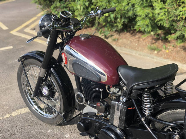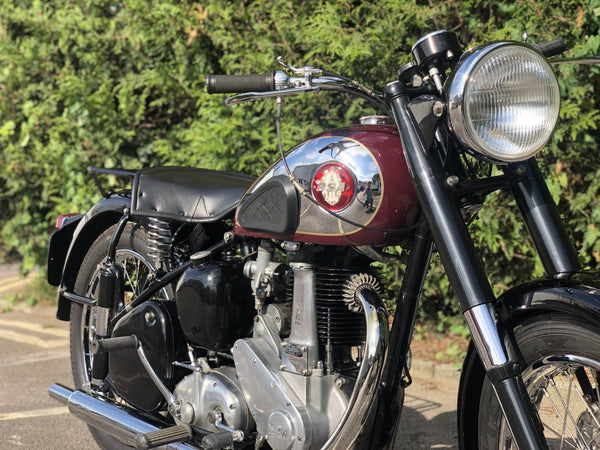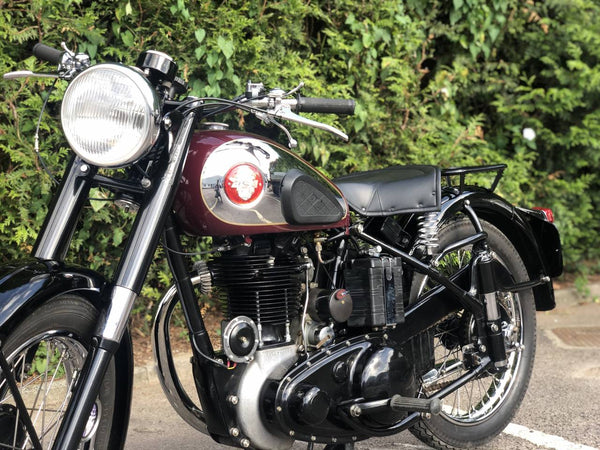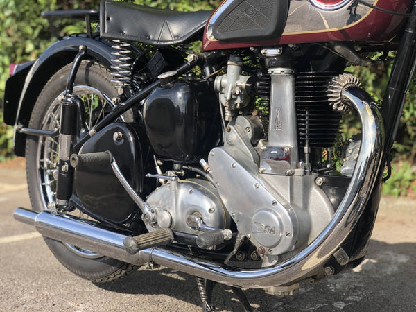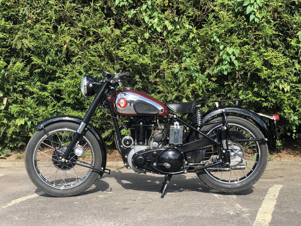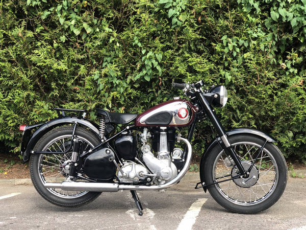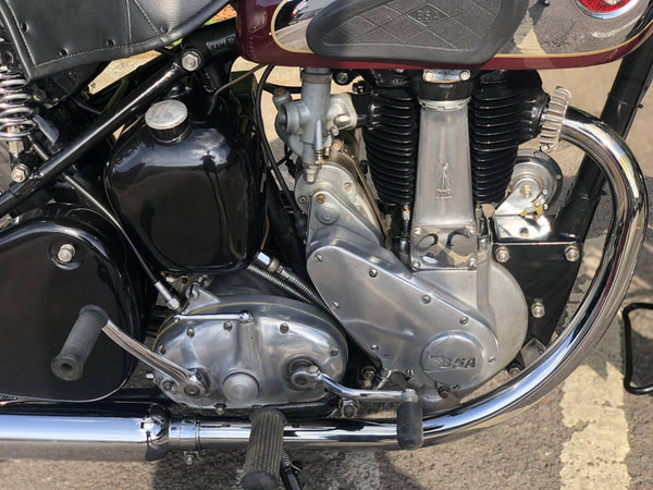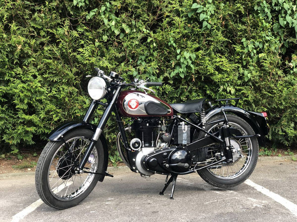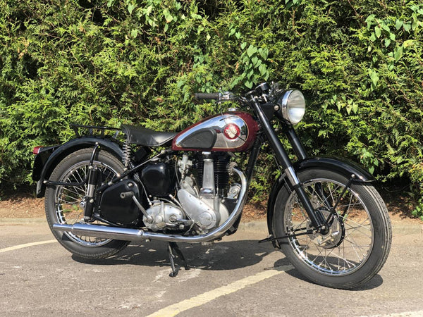 BSA B31 Plunger 1955 350 cc in Bourgondië Chrome en Black. Lijkt zeer goed gerestaureerd en naar de originele specificatie en zeer goed verzorgd en in mooie staat. Begint gemakkelijk goed te tikken en rijdt en presteert ook heel goed. Dit zijn nu erg populaire modellen