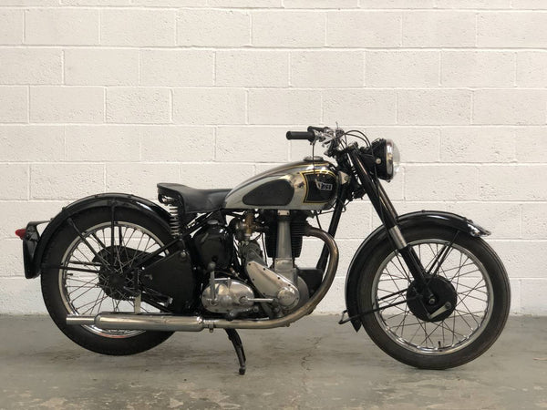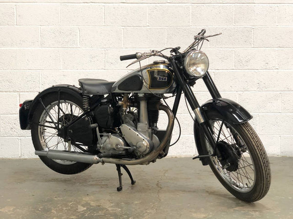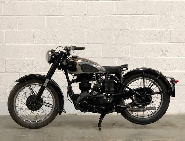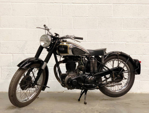 BSA B33 1947 500 Dit is een heel vroeg en nu zeldzaam voorbeeld met de Speedo in de tank. Dat ziet er prachtig uit in zijn chroom- en zwarte kleurenschema. Begint gemakkelijk, loopt en rijdt ook mooi, met een zeer mechanisch rustige motor, met slechts 2 voormalige keepers.