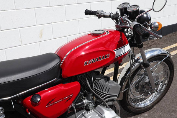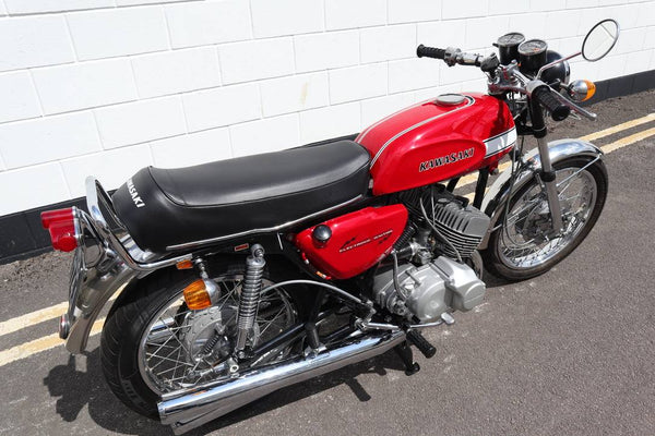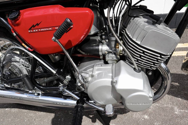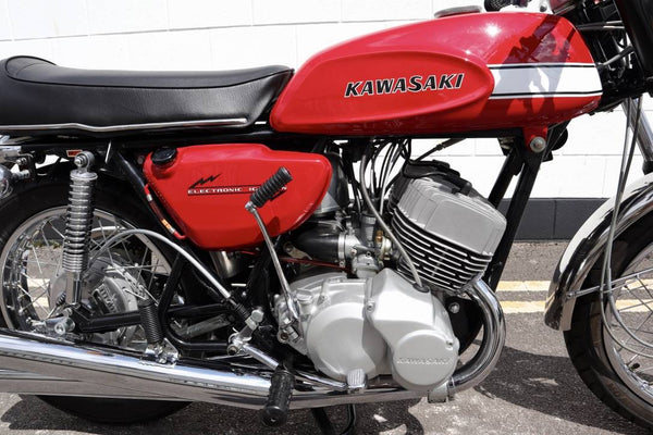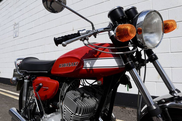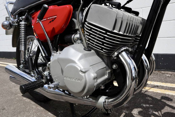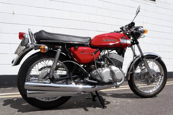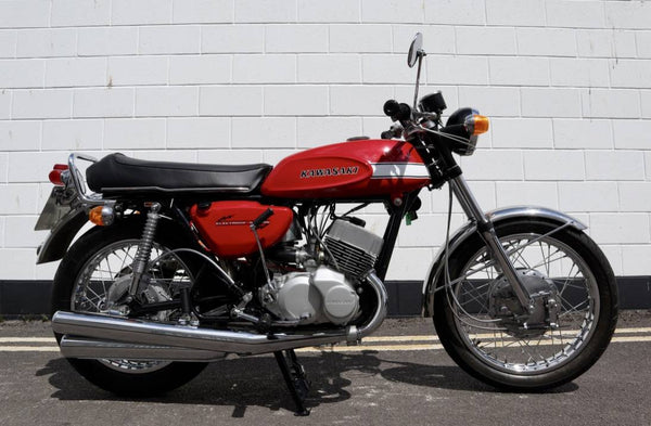 1970 Kawasaki H1 Mach III - 3 500cc. Volledig hersteld naar een hoge standaard en nog steeds in uitstekende staat. Lijkt allemaal correct zal al zijn oorspronkelijke onderdelen. Begint gemakkelijk met een gratis revving -motor zoals te zien in de video. Deze vroege H1's hebben de afgelopen jaren een geweldige investering bewezen en zullen blijven met steeds toenemende inflatie. Een fantastische aanwinst voor elke collectie. Klaar om te rijden of te laten zien!