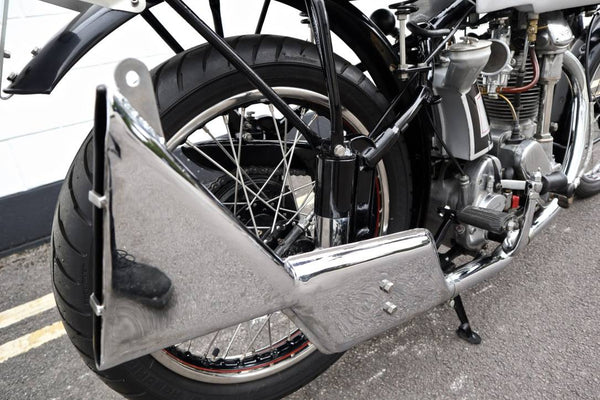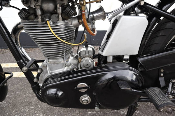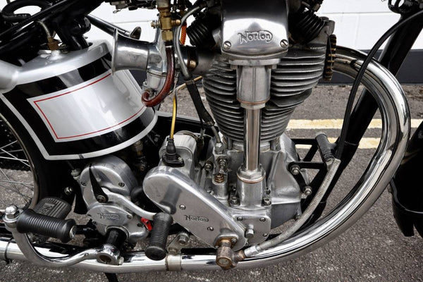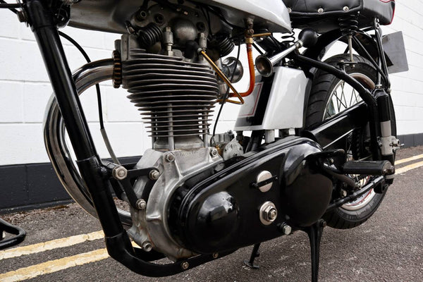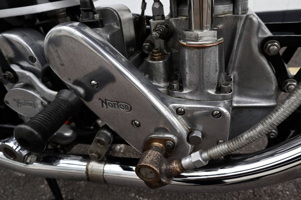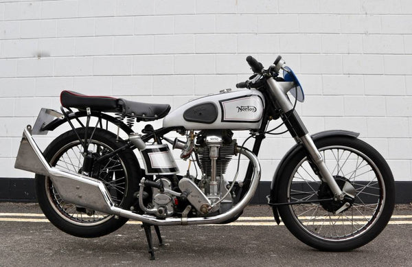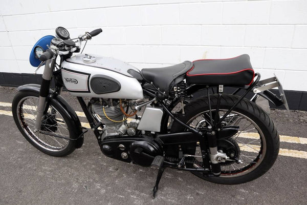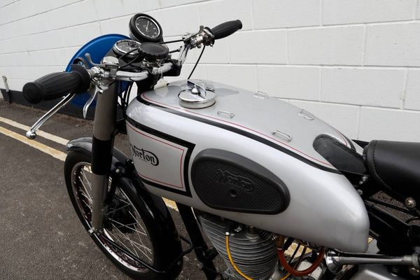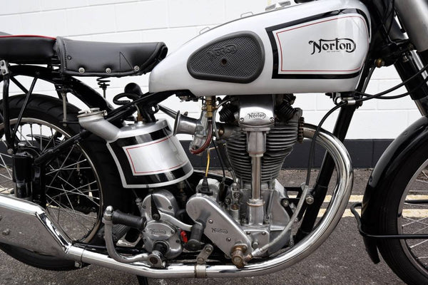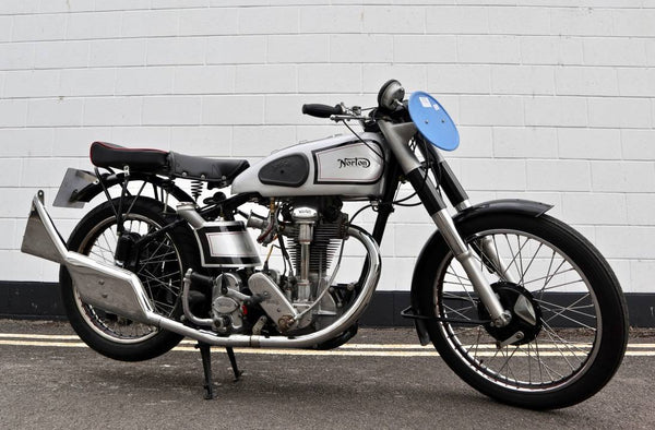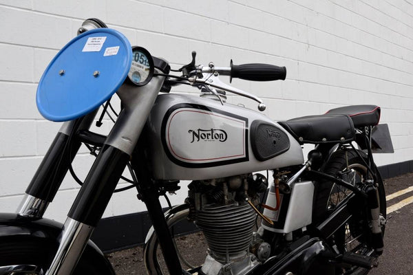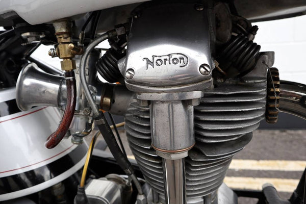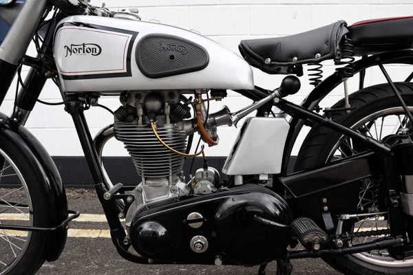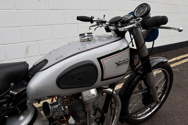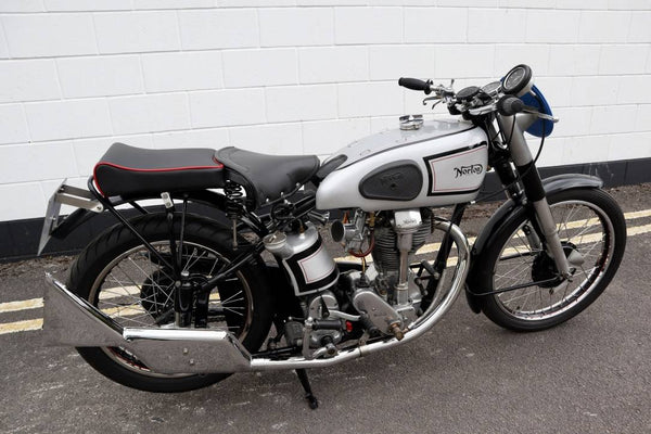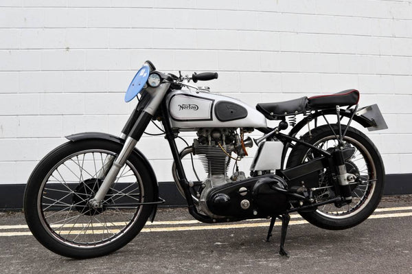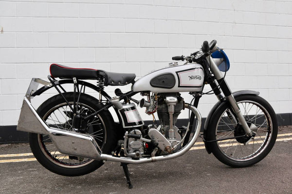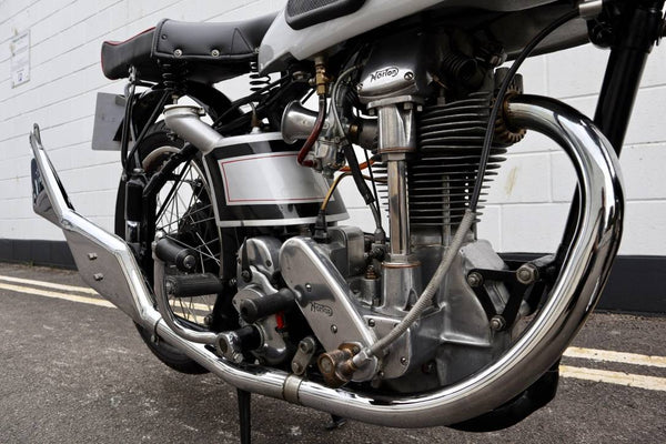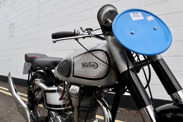 Factory geleverd in Clubman Spec en racete door Bill Camier in het Isle of Man TT van 1949 met foto's. Deze machine heeft nu een duidelijk opzet van de weg die een comfortabele maar sportieve rijpositie heeft aangetoond door de opgestane balken en het gebrek aan 'bum-perch'-stoel. De elegante maar rorty Brooklands-uitlaatglag, achterste voetsteunen en gebrek aan lichten richten de balans terug naar Road Racer. Er is een VMCC -certificaat van authenticiteit met betrekking tot de fabrieksrecords. Dit is een uitstekend voorbeeld dat klaar is om te rijden met een interessante geschiedenis. Een fantastisch uitzien en rijden Norton Inter!