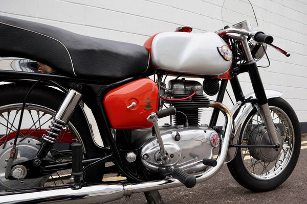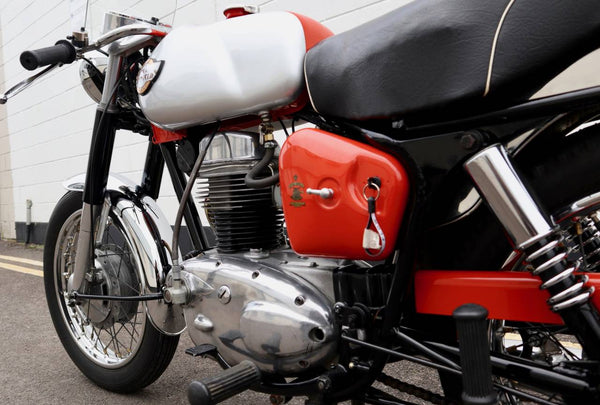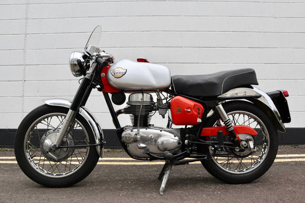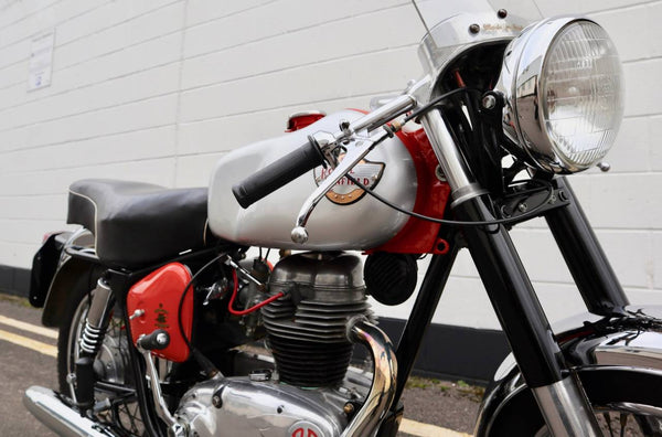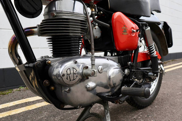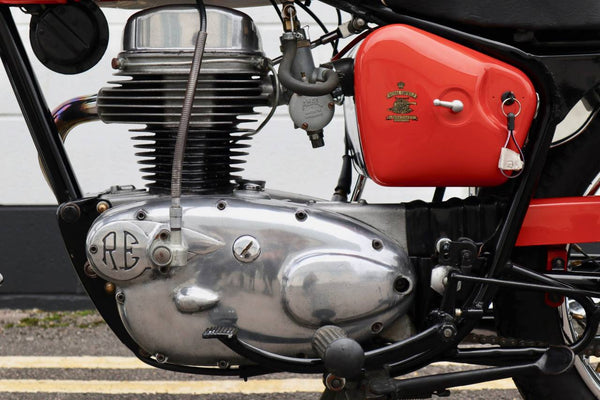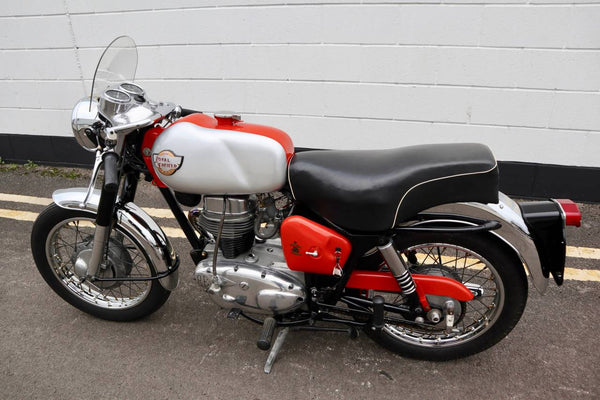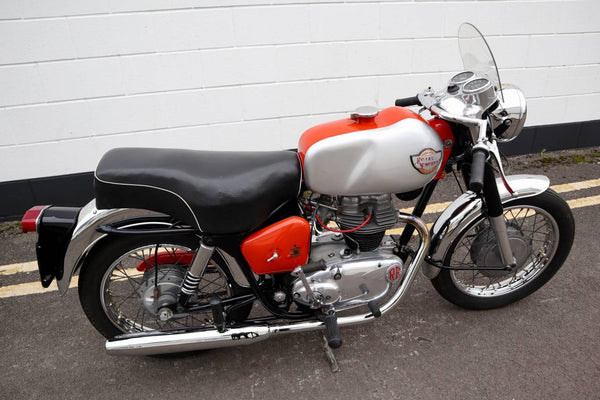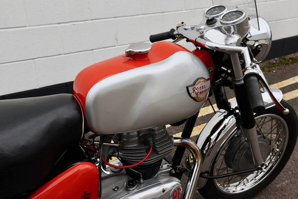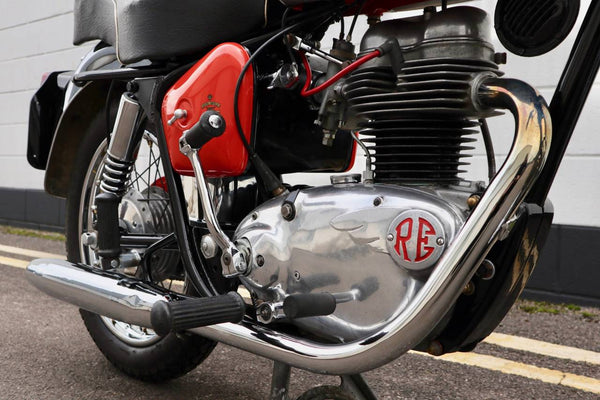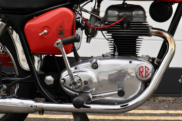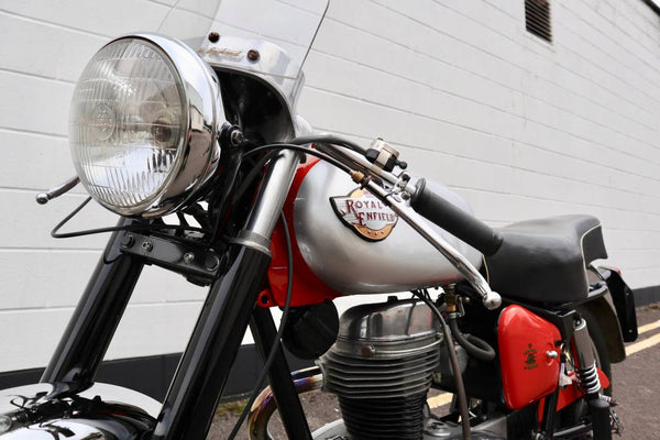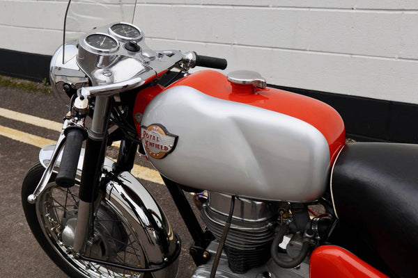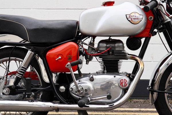 1963 Royal Enfield Continental 250cc. In prachtig gerestaureerde staat. Een zeer zeldzaam model is de voorganger van de GT250 en hogere specificatie gebouwd met dubbele chronometrische klokken en stalen brandstoftank. Deze fiets heeft bijpassende nummers volgens het "Buff" -logboek dat samen met de laatste belastingschijf uit 1993 ermee wordt geleverd. Er is ook een onderdelenboek- en workshophandleiding.