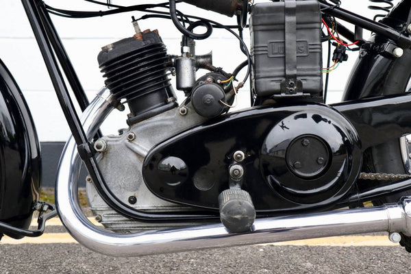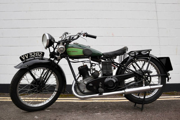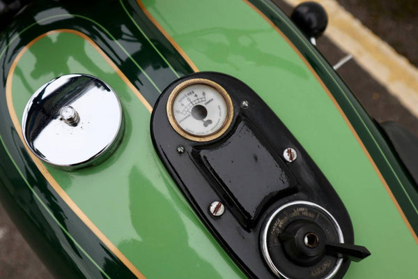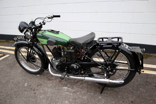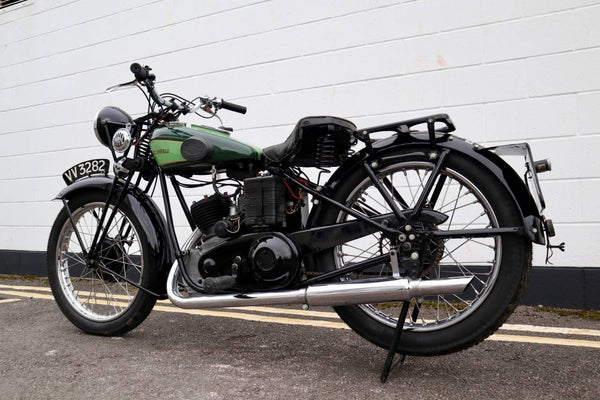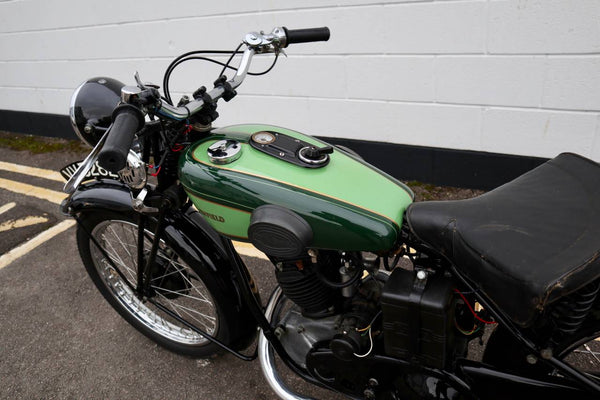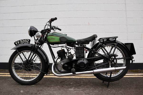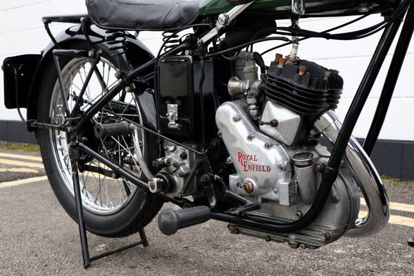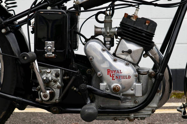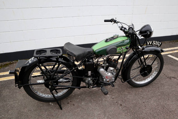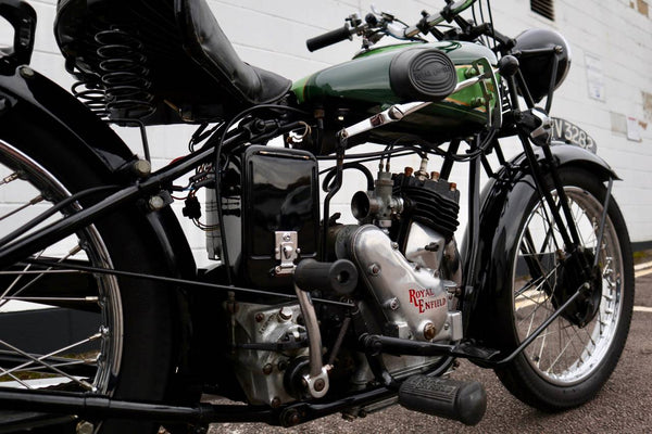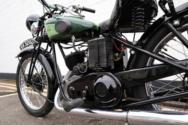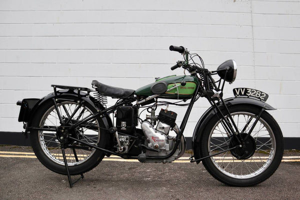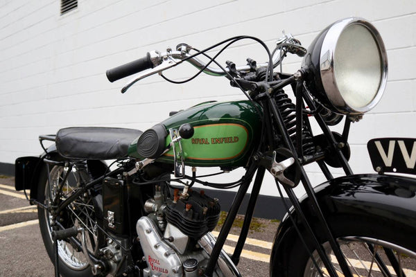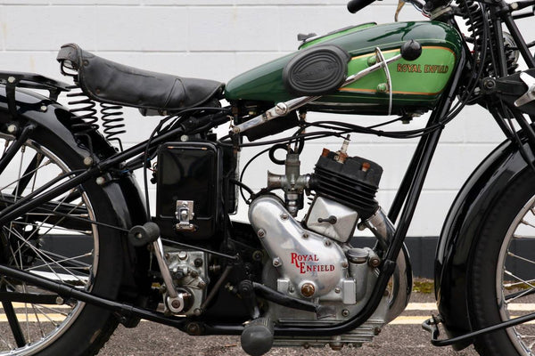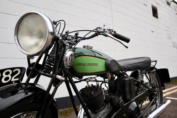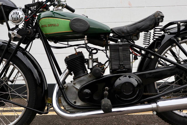1934 Royal Enfield 250cc zijklep Handuitrusting Verandering. Gerestaureerd door een van de vorige eigenaren op lange termijn die de balkvorkspecialist was van de Royal Enfield Owners Club. Recent werk dat wordt uitgevoerd, omvat nieuwe banden en batterij, verse motorolie en semi -vloeistofvet in de versnellingsbak, stel de timing- en kleppenvrijheden in, saaie de smeerpunten enz. Gemakkelijk begint, loopt goed, alles werkt zoals het hoort; remmen, versnellingen, lichten, ladingen goed enz. Ze is opnieuw bedraad met een moderne spanningsregelaar. Een mooi voorbeeld van een lichtgewicht vintage motorfiets!