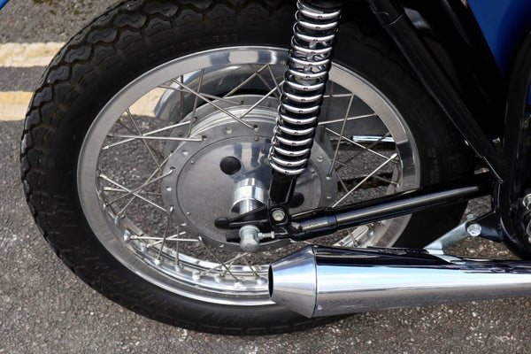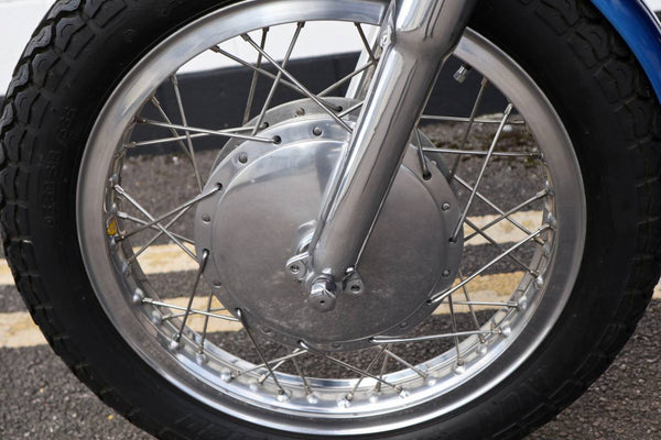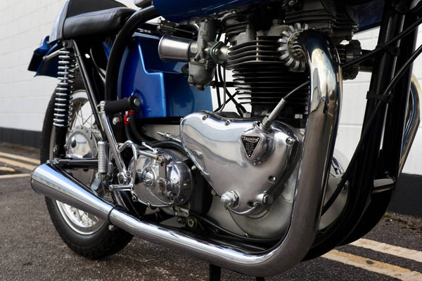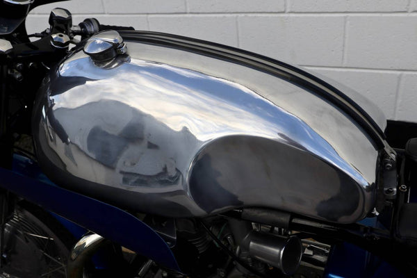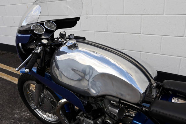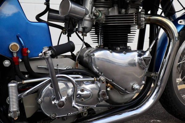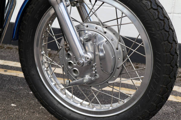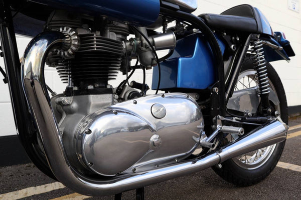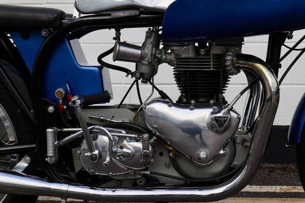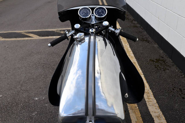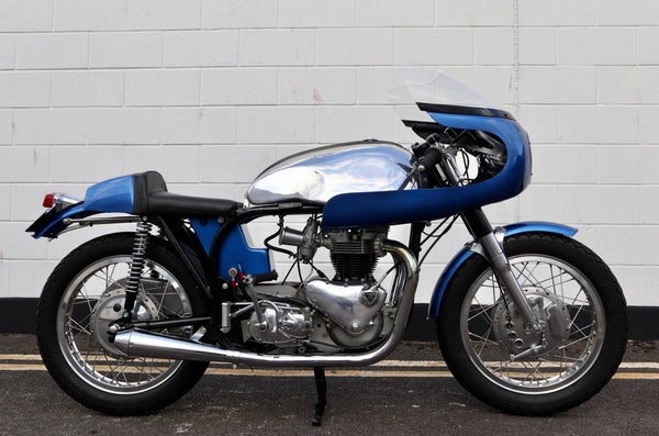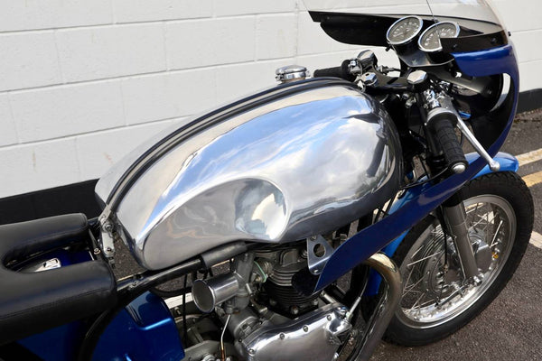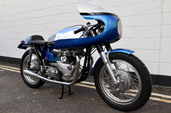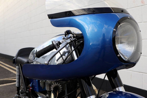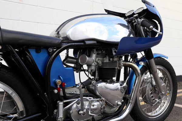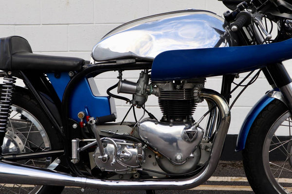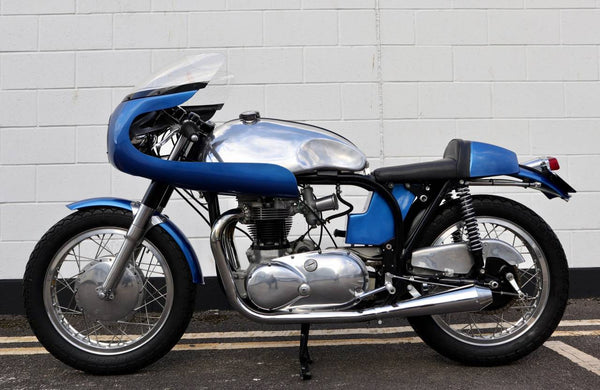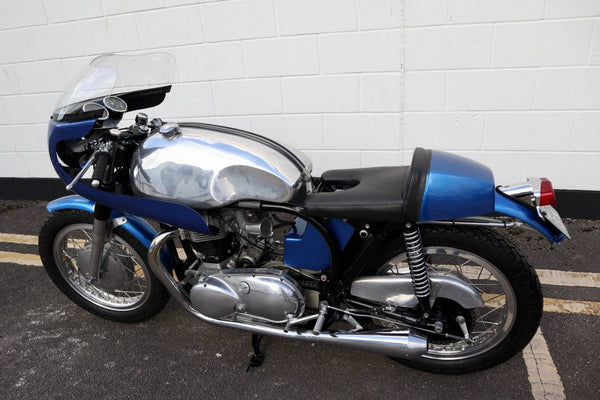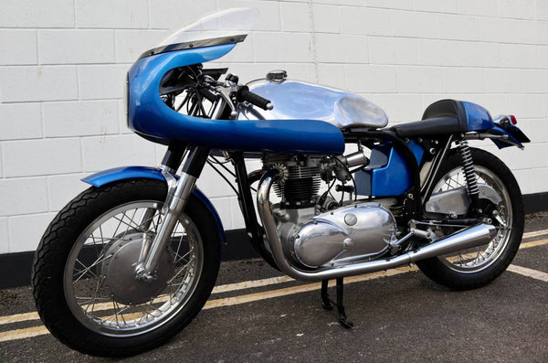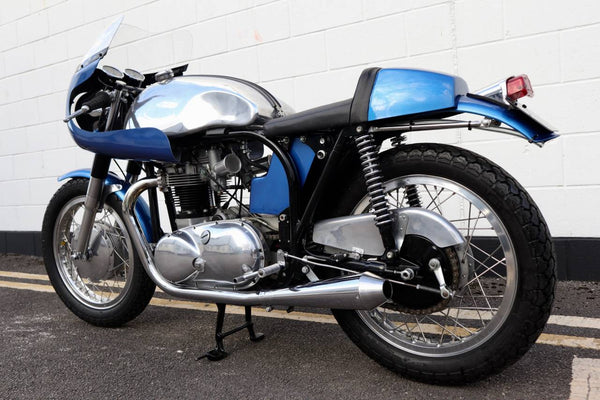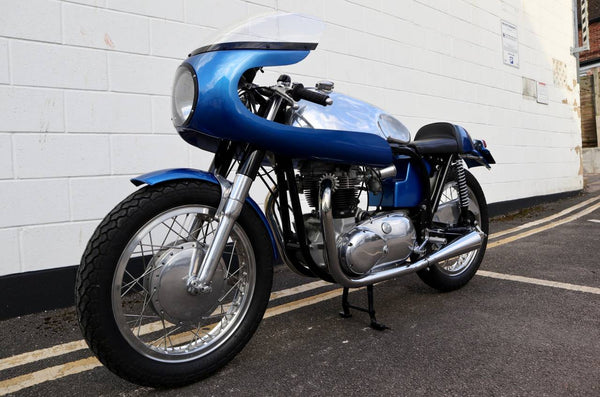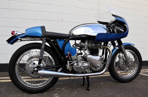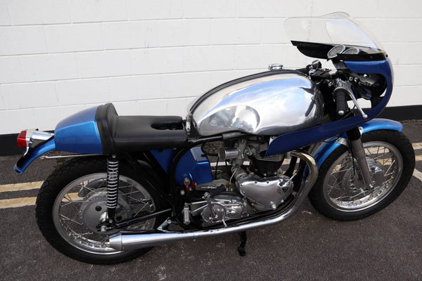 1971 Triton 650cc Cafe Racer. Gebouwd met een 1959 Wide Line Featherbed frame en een pre-Unit 650cc T120 Bonneville-motor uit 1962, werd de bovenkant herbouwd in 2017. Geregistreerd als een Triton in 1971. Met Norton Commando Vented Twin Leading Front Brake, Norton Road Holder Forks, Allie Flent velgen en Allie -benzinetank. Ziet er geweldig uit in blauw kleurenschema en racesneu kegel. Klaar om te rijden of te laten zien, een geweldige investering!