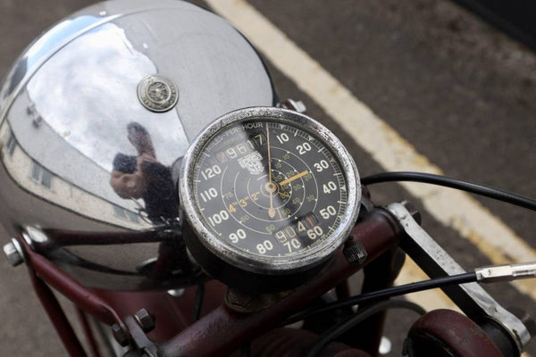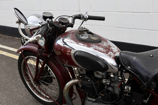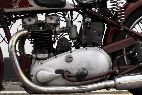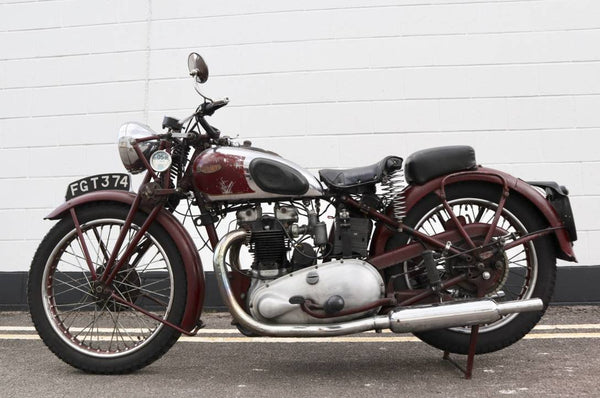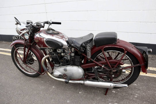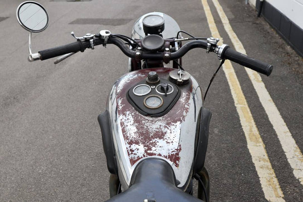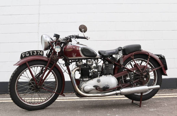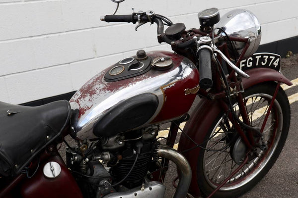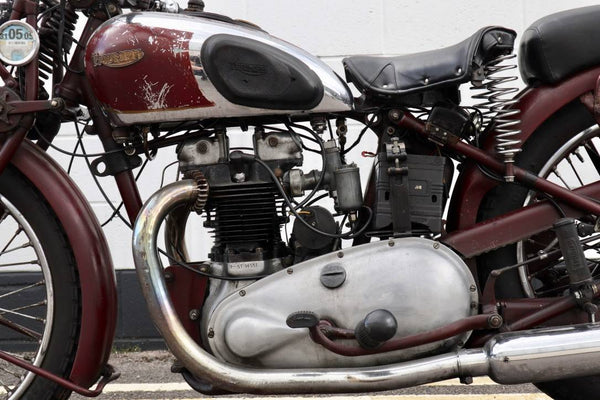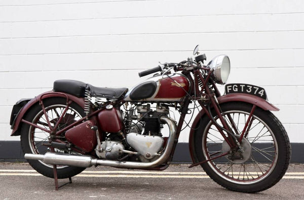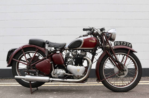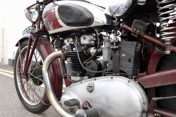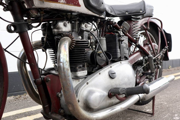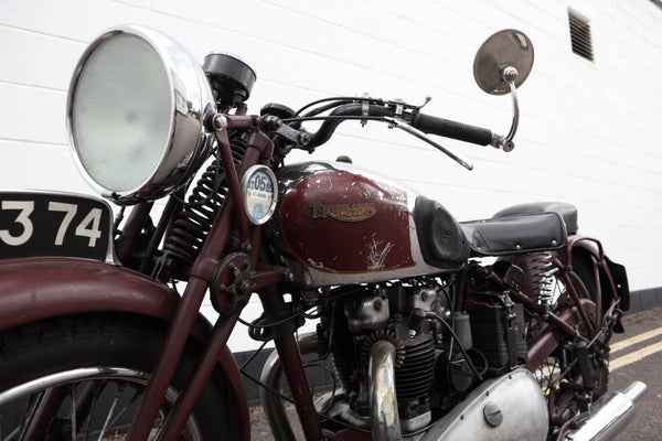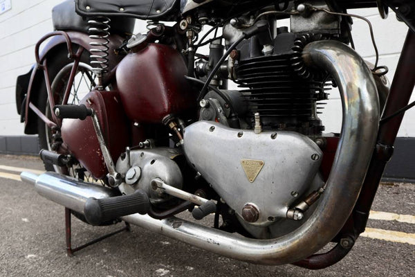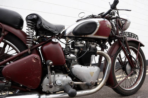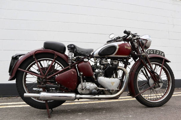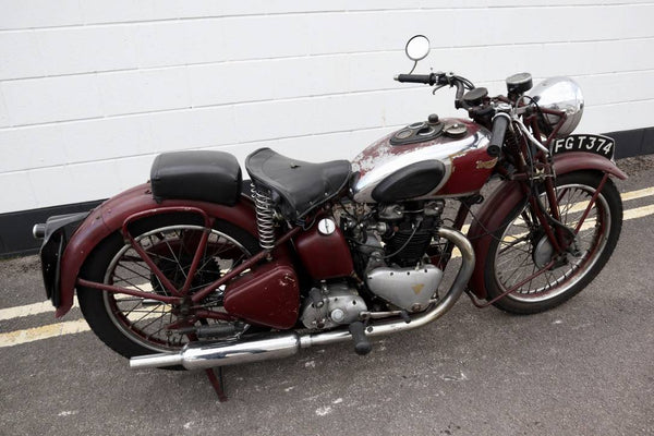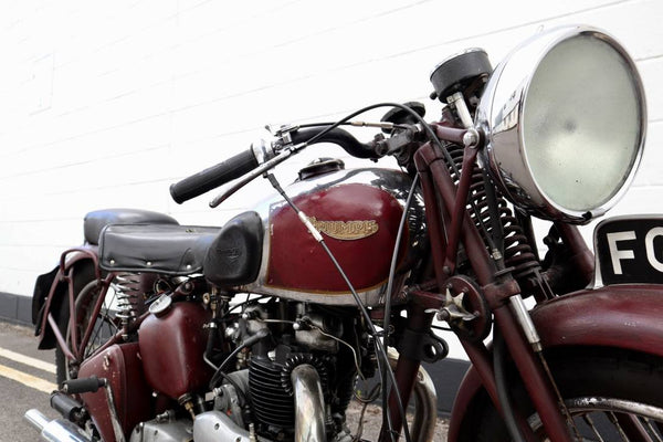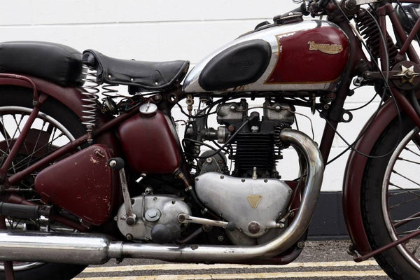 1938 Triumph Pre-War 5t Speed Twin 500cc. Lijkt in zeer zeldzame alle oorspronkelijke staat van nieuw. Begint gemakkelijk en loopt ook en ritten zoals te zien in de video. Uitgerust met een drukontlastklep op het timingdeksel. De fiets is de afgelopen 10 jaar in een collectie in Duitsland geweest, waar deze regelmatig werd gebruikt en onderhouden. Wordt geleverd met een goed bestand met geschiedenis. Een zeldzame kans om een werkende/niet-gerepareerde vooroorlogse snelheid Twin te bezitten!