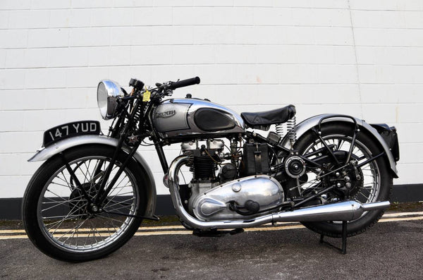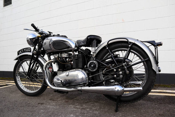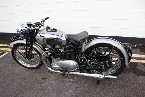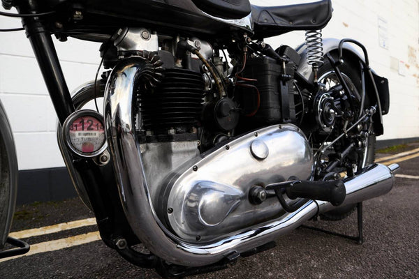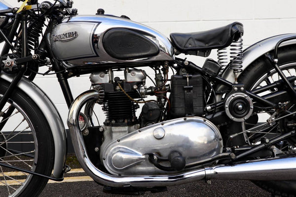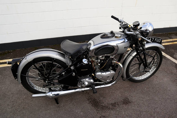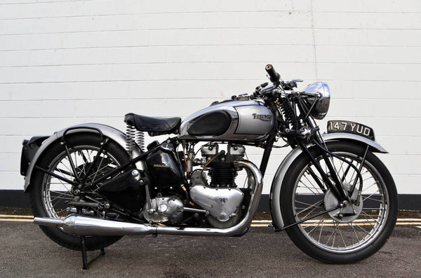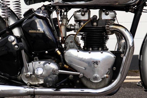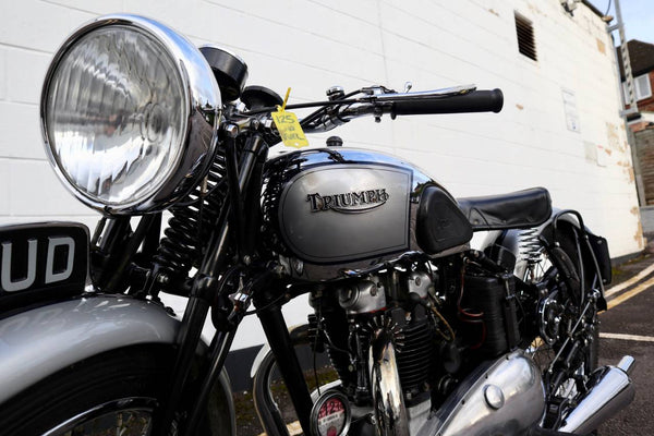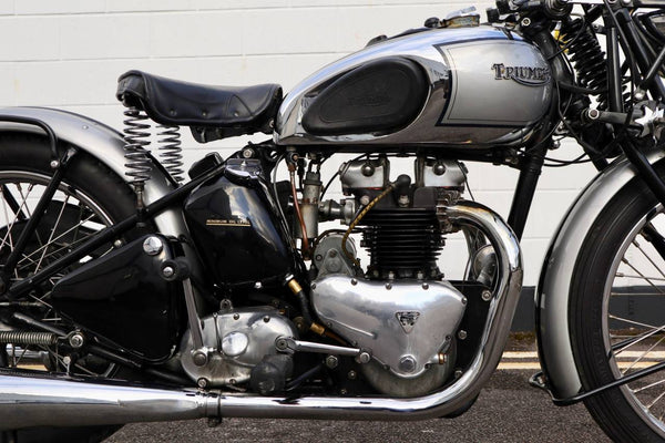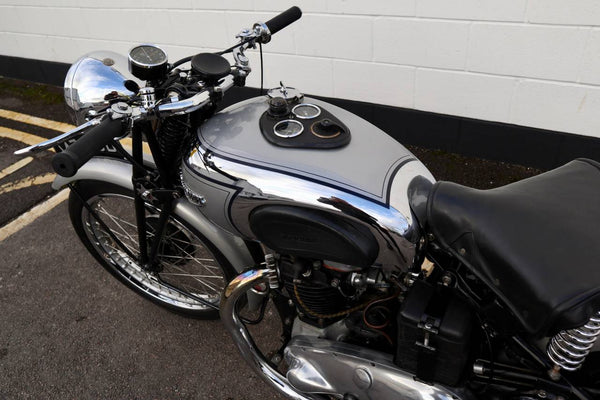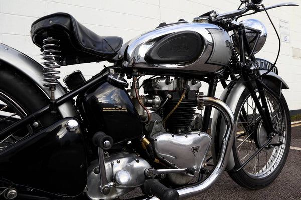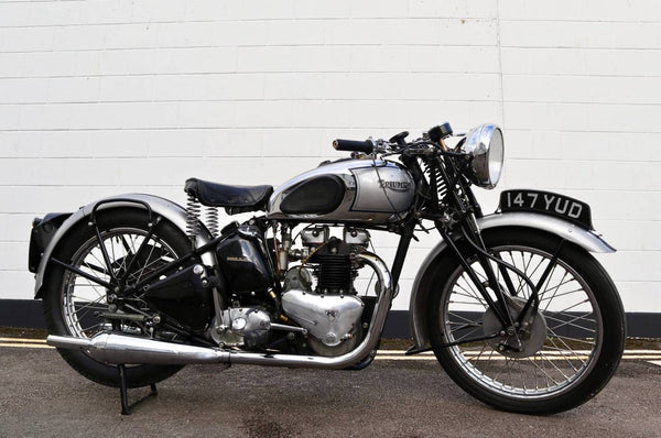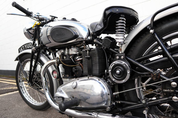 1937 Triumph 500cc T100 vooroorlogse replica. Het leven beginnen als een triomf 6s, deze T100-replica is gemaakt door de overleden eigenaar rond 2010/11 met behulp van vele originele vooroorlogse T100-onderdelen. Gebruikt voor clubruns en evenementen daarna. Dit is zo goed als het echte werk en de helft van de prijs. De V5C is verloren gegaan, maar een vervanging kan gemakkelijk worden verkregen. Wordt geleverd met datingcertificaat en foto's voorafgaand aan restauratie.
