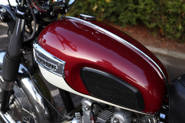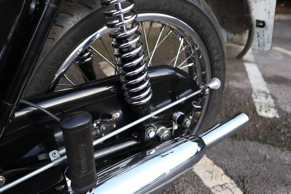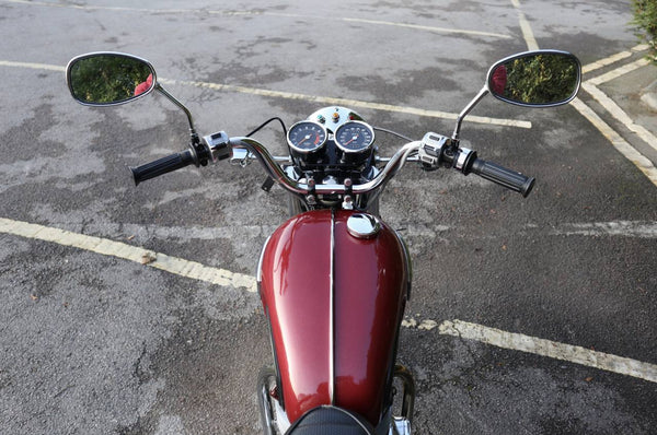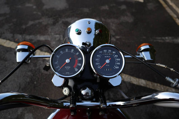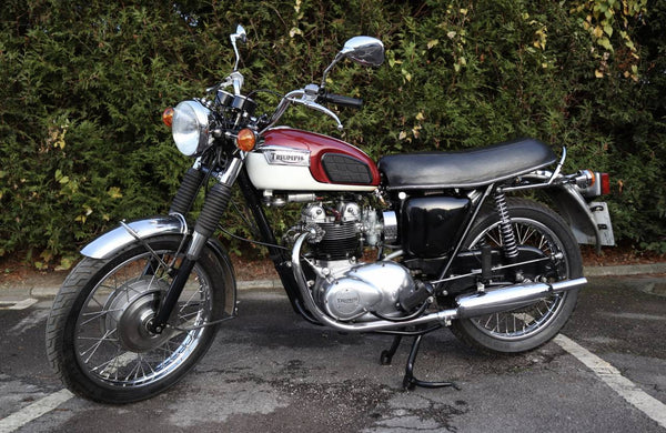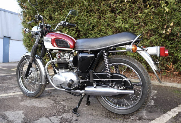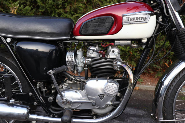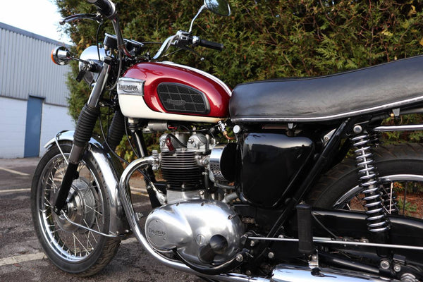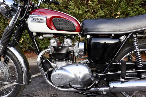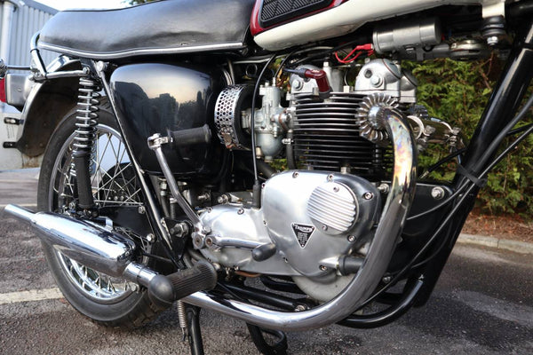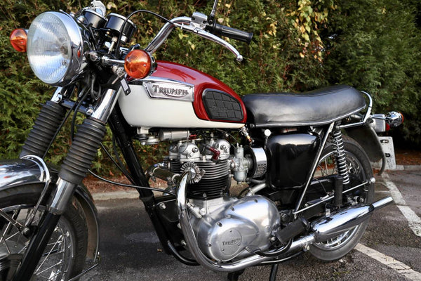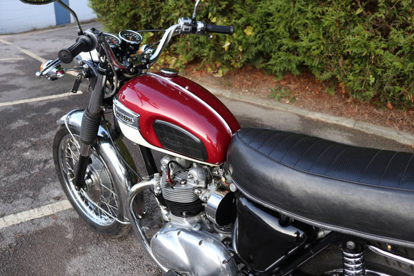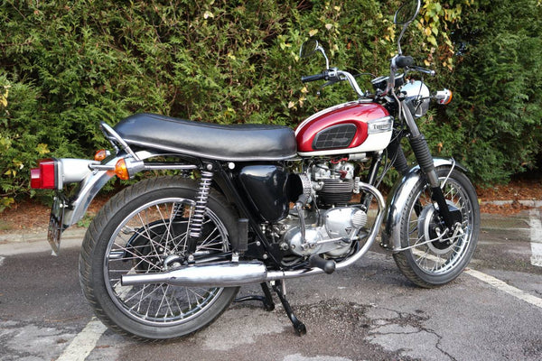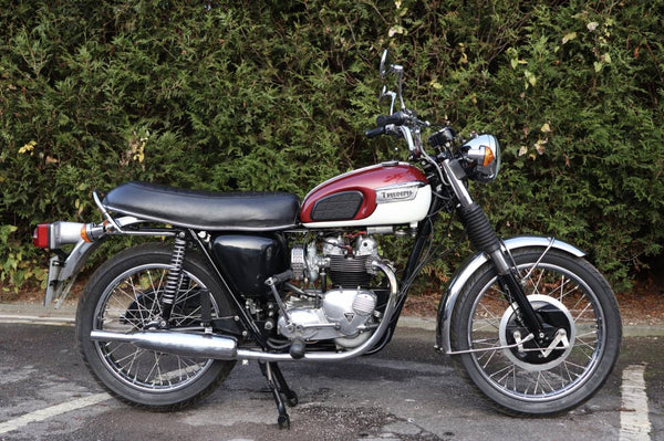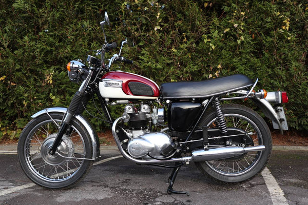 1973 Triumph T100R Daytona 500cc met bijpassende nummers. Het lijkt een paar jaar geleden te zijn gerestaureerd met veel roestvrijstalen, waaronder spaken, velgen, noten, bouten en bewakers. Loopt en klinkt geweldig. Wordt geleverd met een goed bestand met geschiedenis. Een investering waar je van kunt genieten!