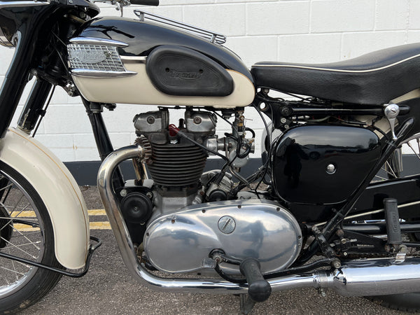 Triumph T110 650cc 1958. In nice condition with non matching numbers. Looks to be an older restoration. Starts up well. The engine is a bit knocky and smokey when rev'd on the right hand cylinder. Would benefit from some work hence lower price.