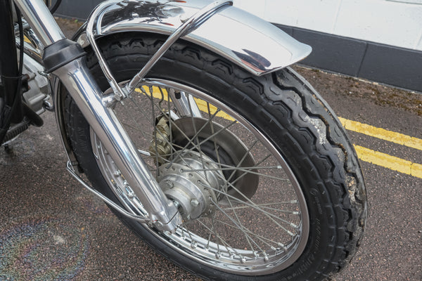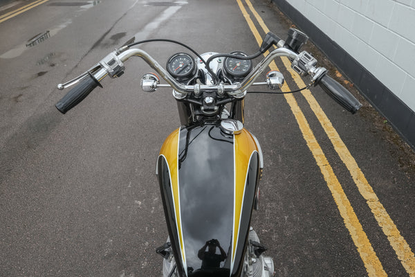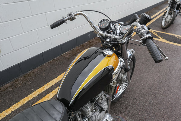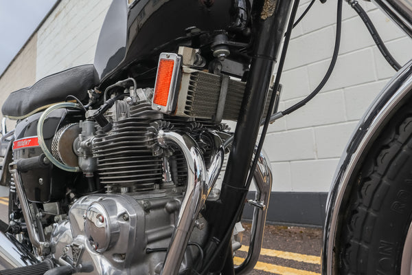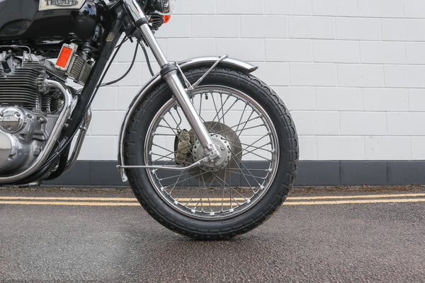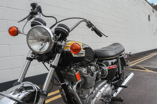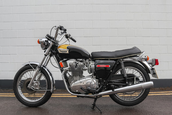 1973 Triumph Trident T150V 750cc te koop. Geïmporteerd uit de VS met bijpassende nummers en op slechts 5422 mijl van nieuw! Ziet er prachtig uit! Dit voorbeeld is van voren naar achteren doorlopen om het erg goed en betrouwbaar te maken, dus een geweldige rennersmachine. Het heeft een paar deuken aan de onderkant van de uitlaatpijpen en een klein gebied van chromen tillen op de achterwielrand, maar begint te runnen en rijdt mooi met echte zeer lage kilometerstand en zeer goed verzorgd en onderhouden. Koopjesprijs voor een prachtig uitziend voorbeeld!