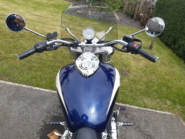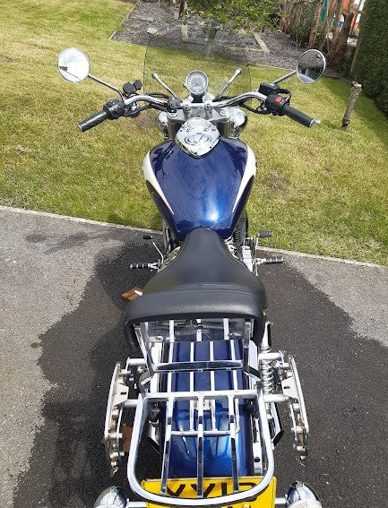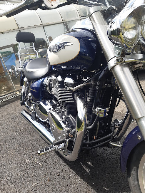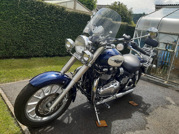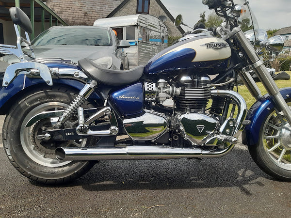2010 Triumph Bonneville America 10,350 dry miles MOT till September, full service history , wealth of extras - touring screen, spotlights, Hepco and Becker panniers, upgraded footpegs and indicators, chrome luggage rack for single seat, custom single seat , sissy bar, alarmed, 5v and 12v sockets, trickle charge wiring. Two keys and documents.