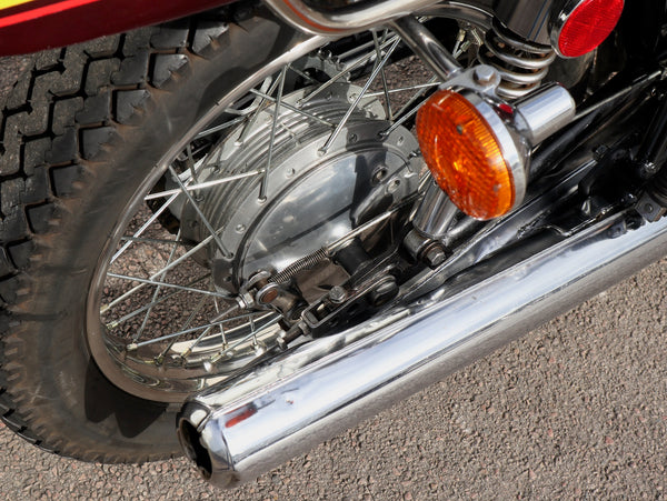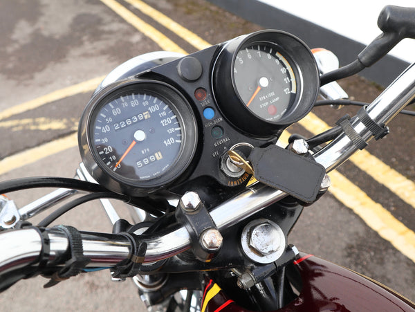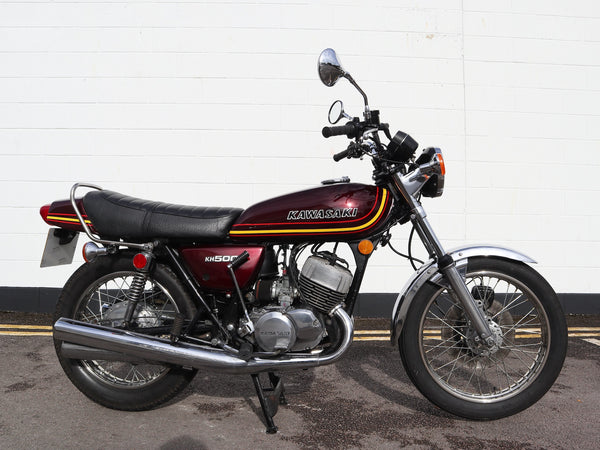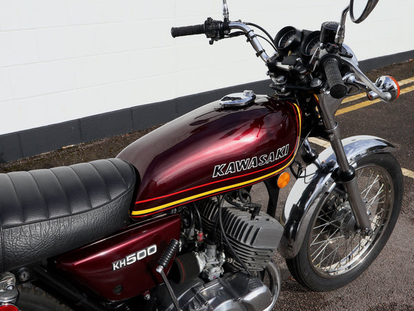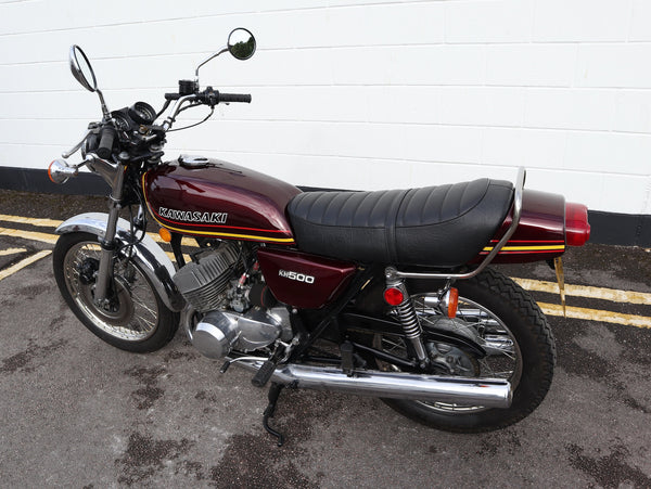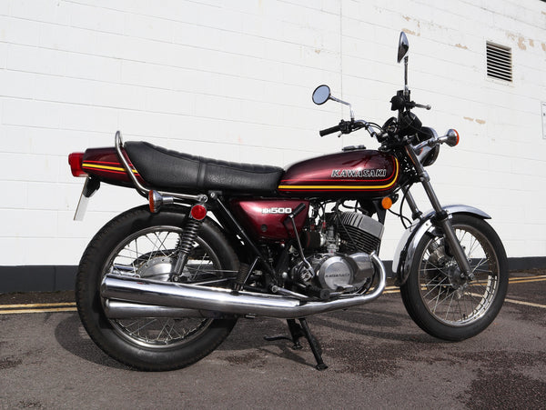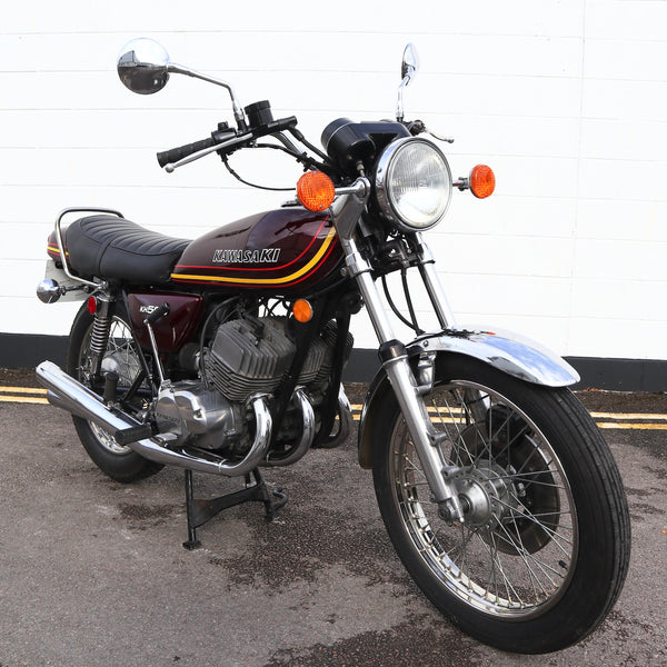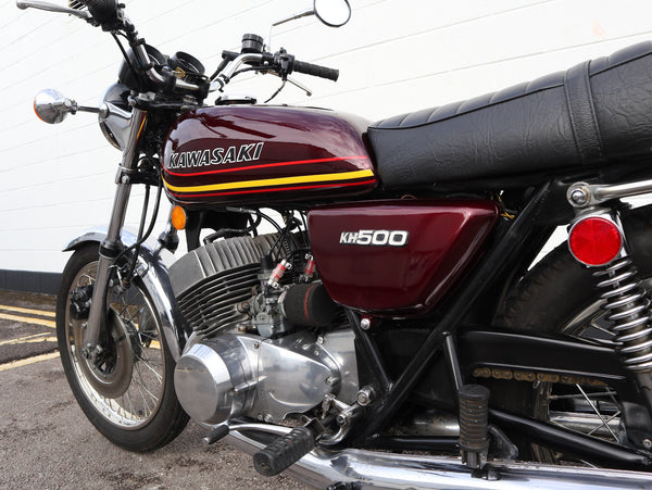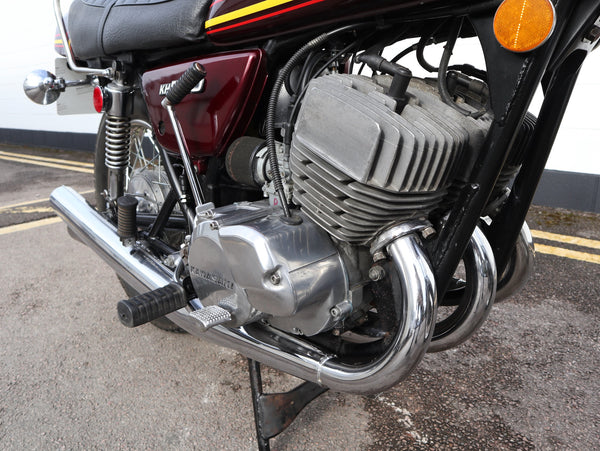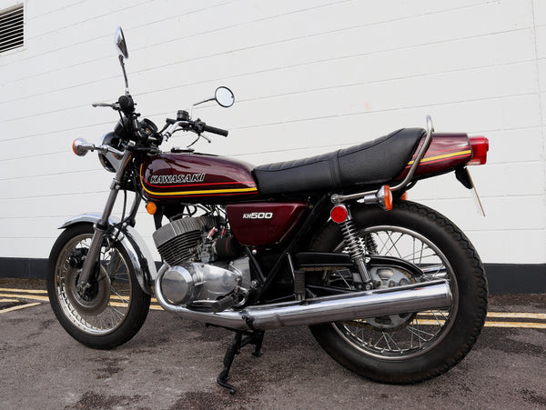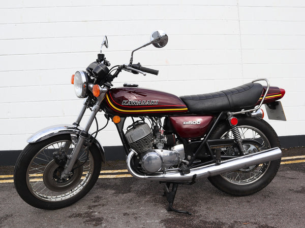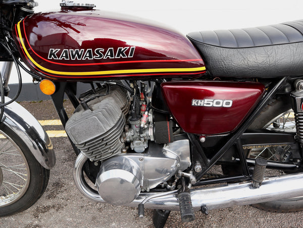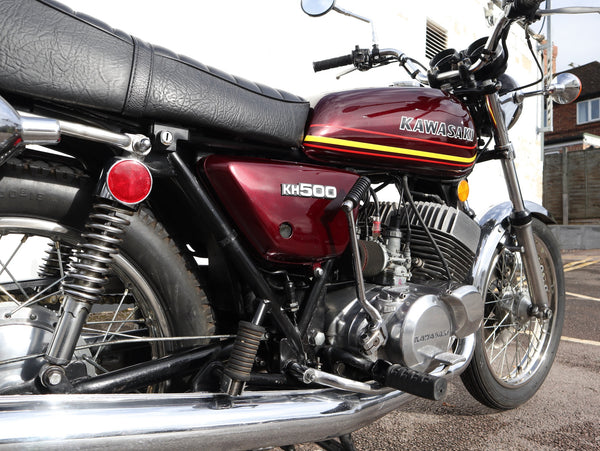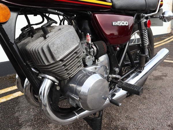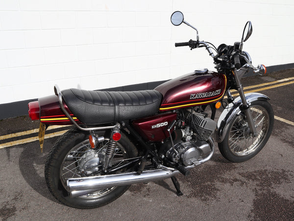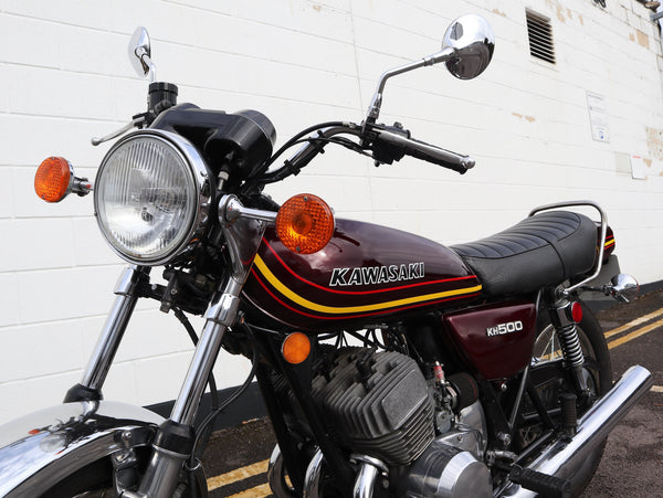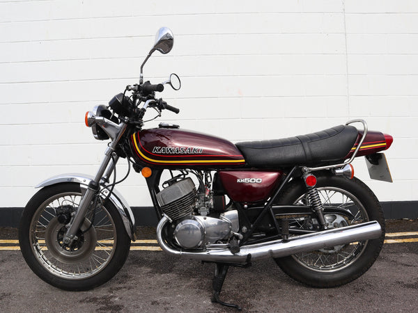 Kawasaki KH500 1975. In nice condition looking to have been well looked after over the years. Still in nice usable condition with original exhaust system. Starts up and runs well. Comes with Kawasaki dating certificate, current log book and some older MOT's. A good usable example.